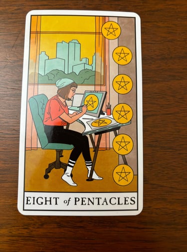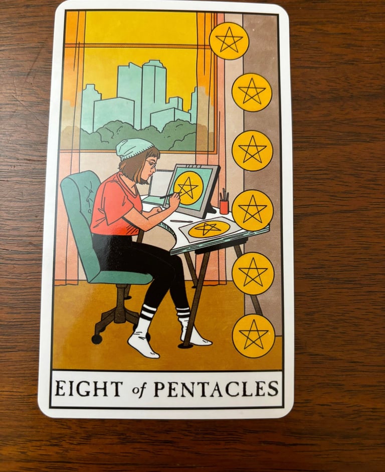 The Eight of Pentacles is a card that encourages dedication, hard work, and the continuous pursuit of excellence. It serves as a reminder that mastery and success come from persistent effort and attention to detail.