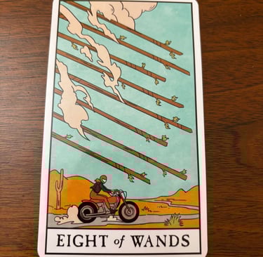 Overall, the 8 of Wands is a dynamic and energetic card, often bringing a sense of excitement and urgency to the situation at hand.