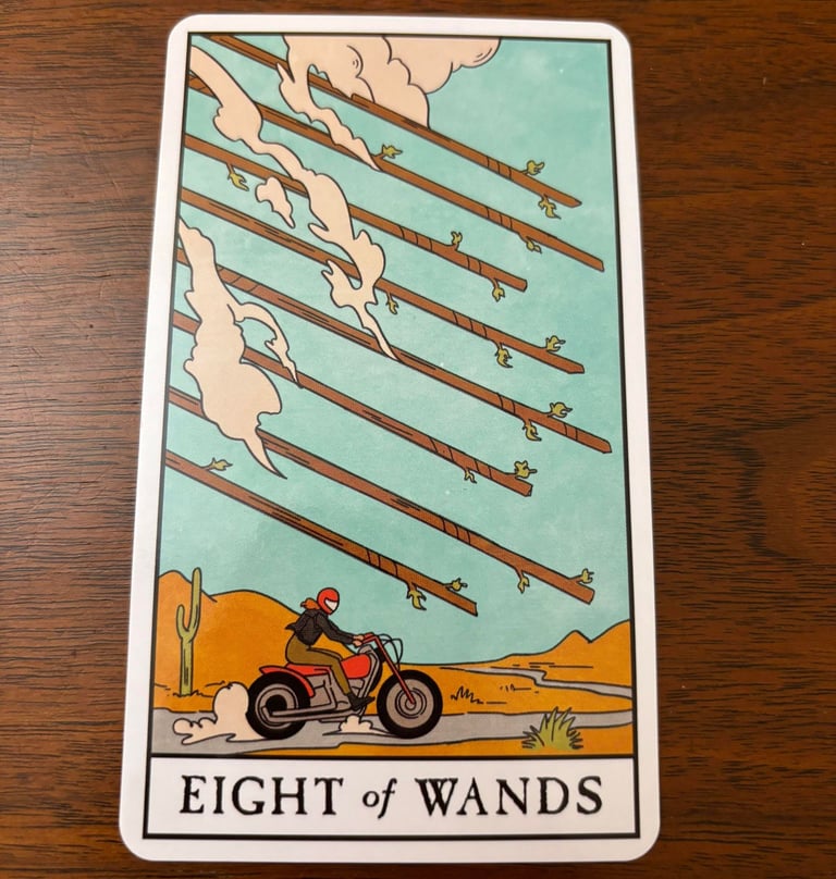 The card typically depicts eight wands flying through the air, often against a backdrop of a clear sky or landscape. This imagery suggests movement and progress, as well as the energy and momentum driving things forward.