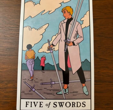 Conflict and Defeat: The Five of Swords often indicates a situation where conflict has led to defeat or loss. It suggests a hollow victory where the cost of winning is high, and the victory may not be worth the suffering it has caused.