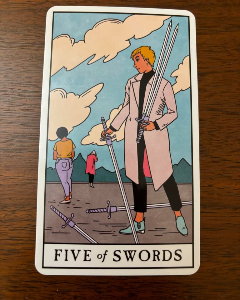 The Five of Swords is often associated with conflict, defeat, and betrayal.