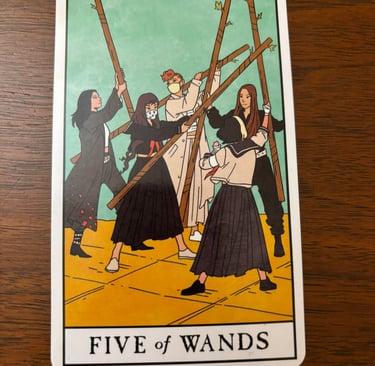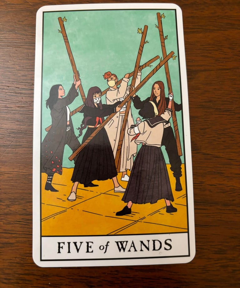 Wands: Representing the element of fire, wands are associated with action, ambition, and creativity. The number five signifies change, challenge, and conflict.