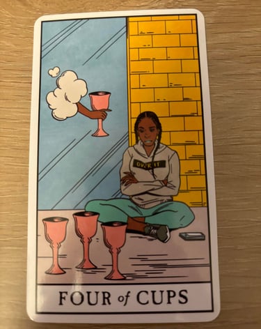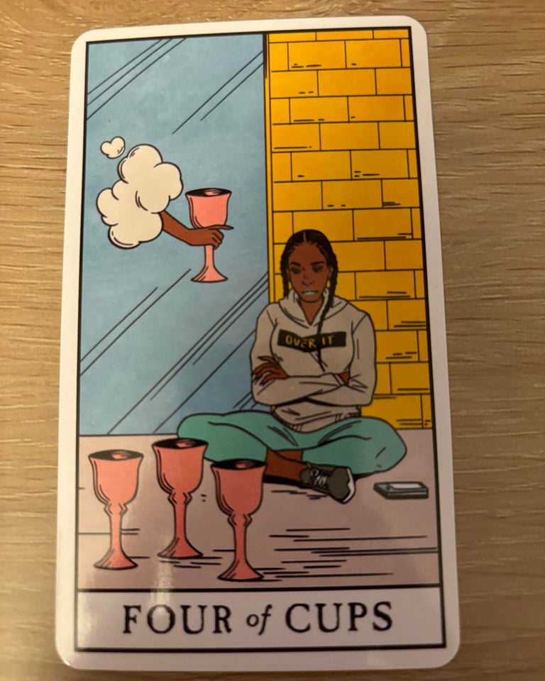 The Four of Cups is a card often associated with introspection, contemplation, and emotional reevaluation.