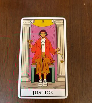 The Justice card is a Major Arcana card in tarot, typically numbered XI. This card is a symbol of balance, fairness, truth, and the law. The imagery on the Justice card often includes a seated figure, often a woman. This figure represents justice personified. She is often depicted sitting on a throne, signifying authority and a calm, considered approach. In one hand, she will being carrying the scales symbolize balance and fairness. They weigh the evidence impartially. In the other hand, the sword represents the enforcement of justice and the power to make decisions. It is typically double-edged, indicating that decisions can cut both ways.