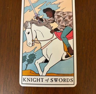 Appearance: The Knight of Swords is often depicted as a knight in armor riding a horse that is galloping at high speed. The knight holds a sword aloft, indicating readiness for action.
