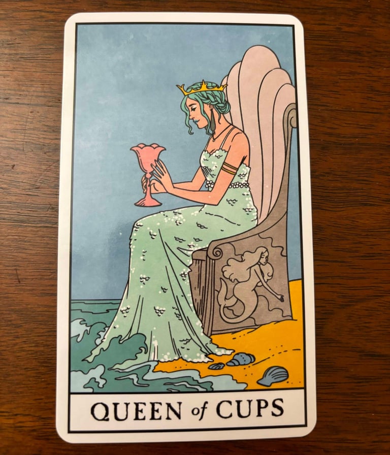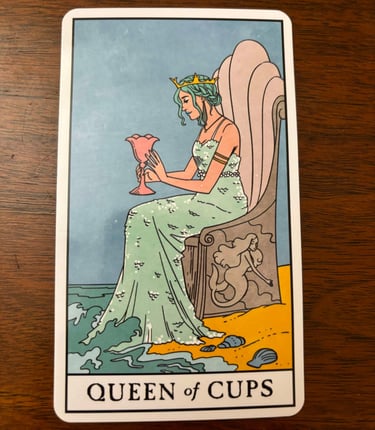 Imagery: The Queen of Cups is typically depicted as a woman sitting on a throne by the sea, holding a cup or chalice. The throne is often decorated with water-related symbols, such as shells or fish. The calm sea and her serene expression suggest tranquility and emotional depth.