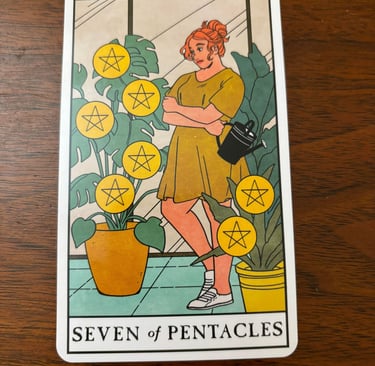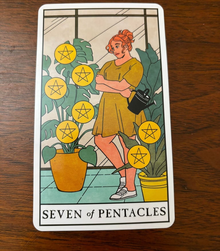 The Seven of Pentacles encourages taking a moment to reflect and evaluate your efforts, understanding that patience and perseverance are key to achieving long-term success.