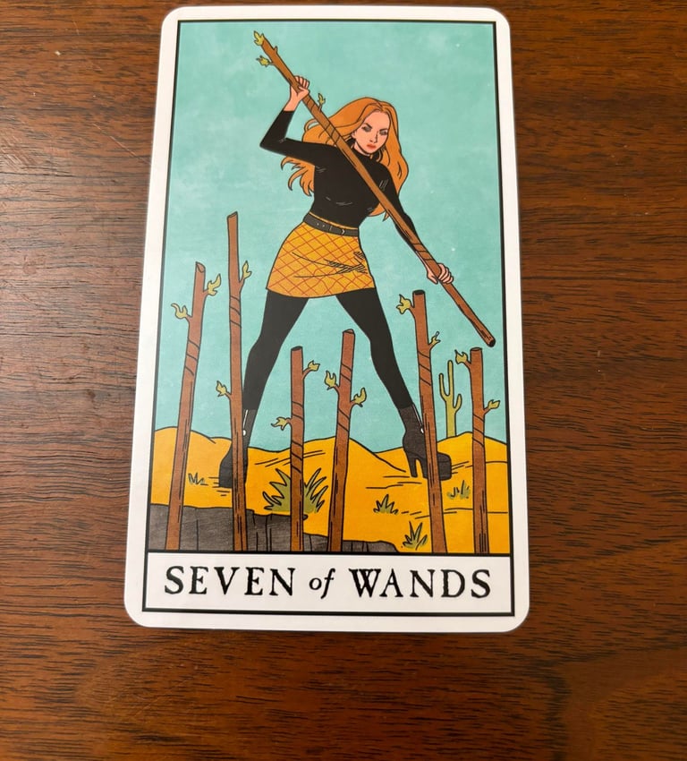 The Seven of Wands is a card of resilience and determination. It emphasizes the importance of standing firm in the face of challenges, asserting oneself confidently, and not giving up despite opposition.