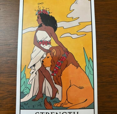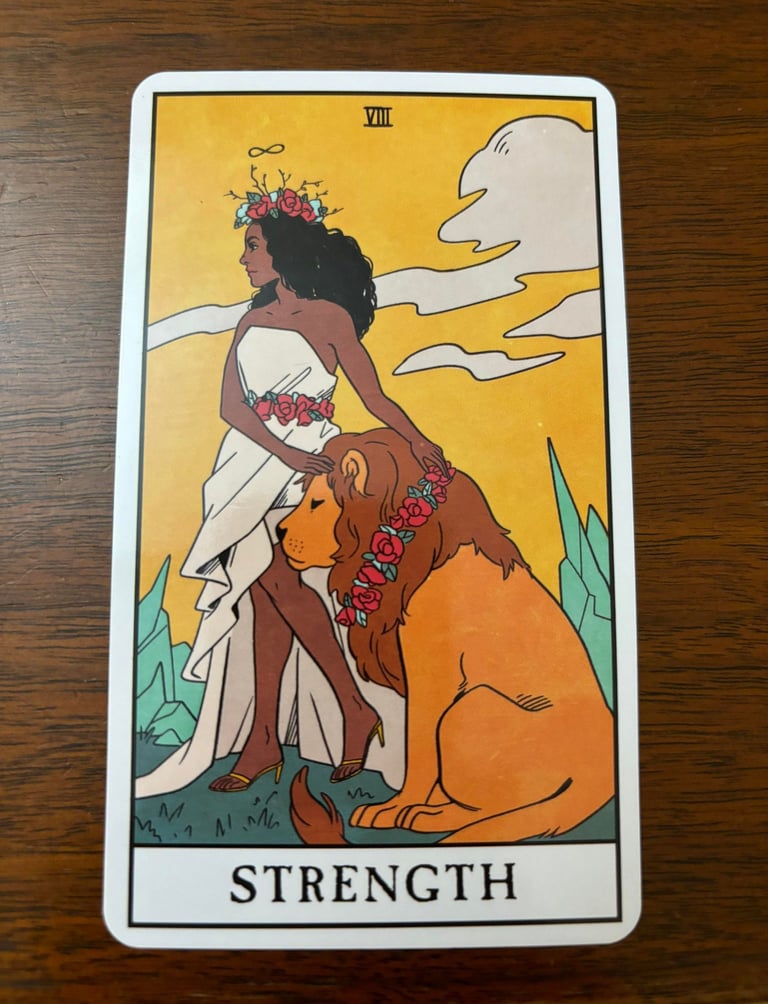 The Strength card is the 8th card in the 22 Major Arcana cards in tarot, typically depicted with a woman taming or interacting with a lion. The woman often wears a white robe, symbolizing purity, and a garland of flowers, which signifies nature and harmony. The lion represents raw passions and primal instincts.