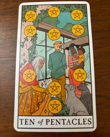 The Ten of Pentacles encourages you to appreciate the stability and prosperity in your life, emphasizing the importance of long-term planning, family bonds, and the legacy you leave behind. It reminds you to cherish the security and harmony that come from dedicated effort and shared values.