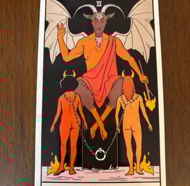 Typically depicted as a horned, goat-like figure, reminiscent of the mythological god Pan or the Christian interpretation of the devil. This figure represents primal instincts, base desires, and materialism. Two human figures, often a man and a woman, are shown chained to the pedestal on which the Horned One sits. This symbolizes oppression, addiction, and being trapped by desires or material concerns. Despite the chains, they are often depicted as loose, suggesting that escape is possible if they choose to free themselves. An inverted pentagram is often seen on the Devil’s forehead, symbolizing the inversion of spiritual values and a focus on the material world. Alternatively, there may be the figure of the Horned One upon an elevated grove in the woods, overlooking the animal kingdom. The Devil sometimes holds a torch, representing the illumination of base desires and passions.