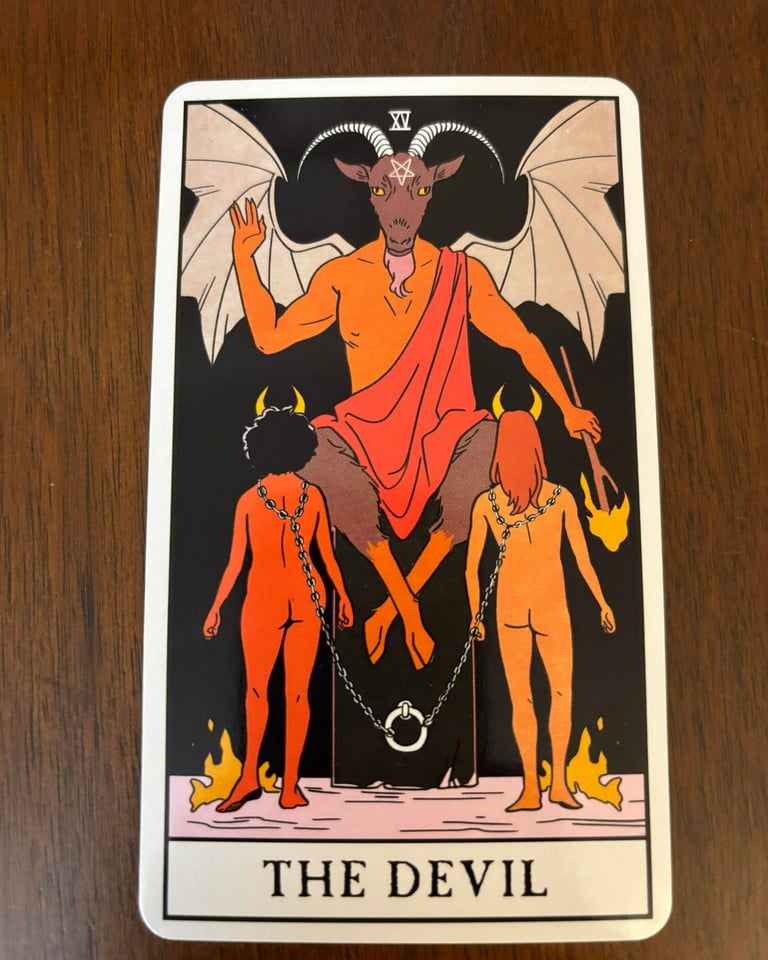 The Devil card is the 15th card in the Major Arcana of the Tarot deck and is sometimes referred to as the Horned One as well. I personally prefer the Horn One, as it is a nod to the guardian of the forest, the Horned God, or Pan in Welsh mythology. It is often the primary symbol of the God in many pagan belief systems.