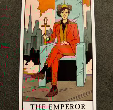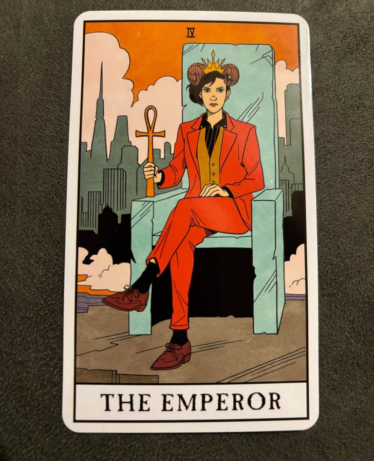 The Emperor card in tarot is a symbol of authority, stability, and structure. It often depicts a wise and powerful ruler sitting on a throne, usually holding a scepter or an orb, signifying their dominion and control over their realm. They represent leadership, authority, and control. They embody the qualities of a strong, decisive leader who takes charge of situations and makes important decisions with confidence and clarity.