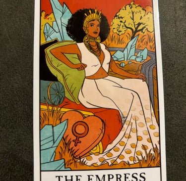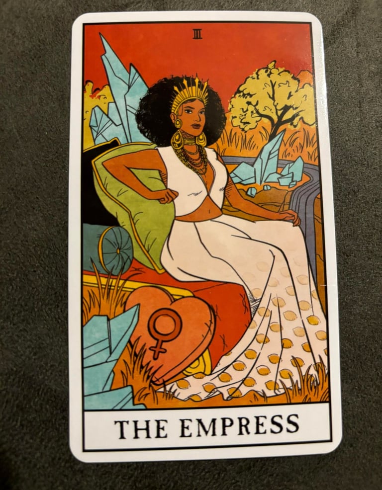 The Empress card in tarot is often depicted as a serene woman seated on a throne surrounded by lush vegetation, symbolizing fertility, nurturing, and abundance. She embodies feminine energy and represents motherhood, fertility, and nurturing qualities. She can signify the nurturing aspect within yourself or the presence of a maternal figure in your life.