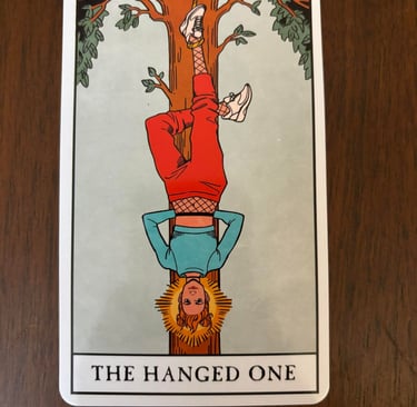 The Hanged One is the twelfth card in the Major Arcana. It is a card rich in symbolism and often seen as a representation of sacrifice, surrender, and a new perspective. The card typically depicts someone hanging upside down by one foot from a tree or a cross made of living wood. Their other leg is often bent, forming a cross shape with their hanging leg.