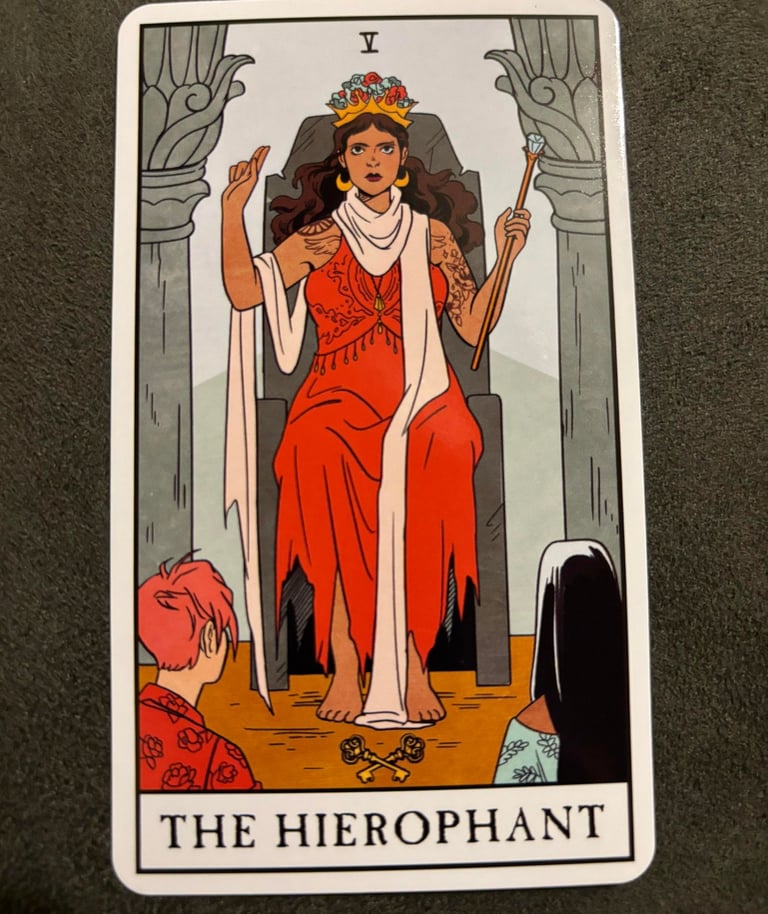 The Hierophant is the fifth card in the Major Arcana of the Tarot deck. It often depicts a religious figure, sometimes a pope or a priest, sitting on a throne with two followers or acolytes nearby. This card represents traditional values, established beliefs, and conformity to societal norms. It signifies adherence to established institutions such as religion, education, or cultural customs.