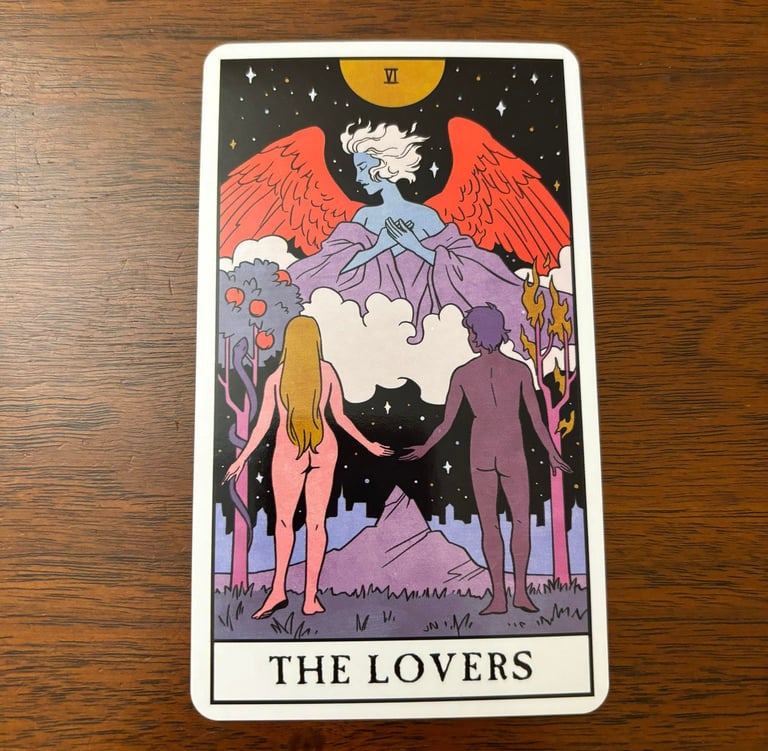The Lovers card is the sixth card in the Major Arcana of a tarot deck, traditionally numbered VI. It is one of the most evocative and complex cards, rich with symbolism and layers of meaning. The card typically depicts a couple, often naked, standing beneath an angel or other worldly being. The entity represents divine love, guidance, and protection, suggesting that the relationship has a higher purpose or spiritual connection.