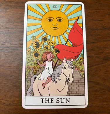 The Sun is 19th of the Major Arcana cards in the Tarot deck, symbolizing positivity, success, and vitality. The imagery on the Sun card typically features a radiant sun shining down, often depicted with a face, symbolizing consciousness and life force. In the foreground, a child, usually riding a white horse, represents innocence, purity, and a fresh start. The child is often holding a red flag or banner, signifying energy and action. Sunflowers or a walled garden may also be present, symbolizing growth, warmth, and protection.
