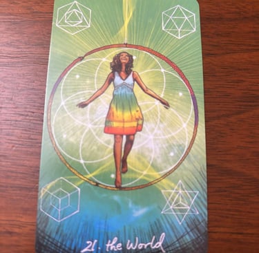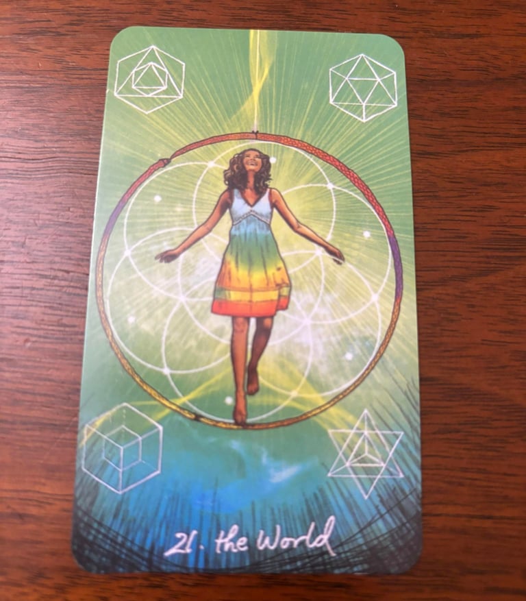 The World card is the 22nd Major Arcana cards in a tarot deck, typically numbered XXI (21). It represents the culmination of a journey and signifies completion, fulfillment, and the attainment of a significant goal. The card usually features a naked figure, often depicted as a woman, dancing within a wreath or laurel. The figure represents a state of completion and harmony. The circular wreath symbolizes wholeness, eternity, and cycles. It suggests that the journey has come full circle. In each corner of the card, there are typically four symbols: a lion, an ox, an eagle, and a man. These are associated with the four fixed signs of the zodiac (Leo, Taurus, Scorpio, and Aquarius). They represent the four elements and the four directions, signifying balance and universality. The central figure often holds two wands or batons, symbolizing balance and the union of opposites.