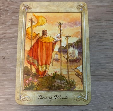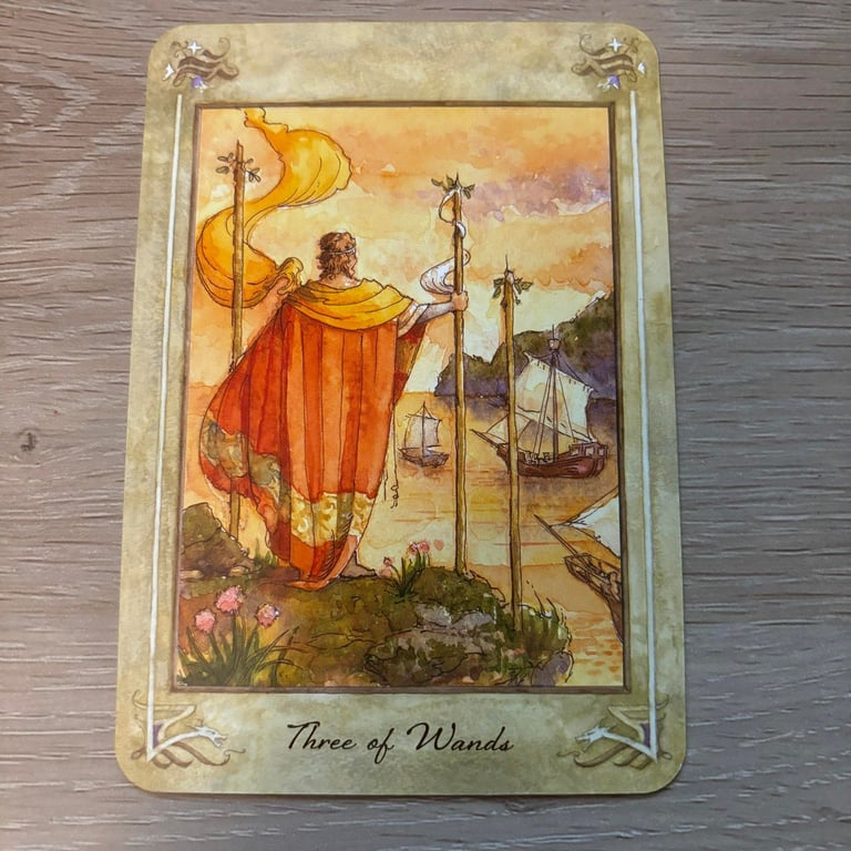 The Three of Wands generally depicts a figure standing on a cliff, looking out over the sea and distant mountains. The figure often holds a wand firmly, with two other wands planted in the ground beside them. This imagery symbolizes stability, preparation, and the beginning of a journey or enterprise.