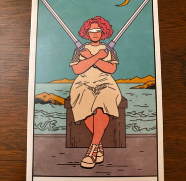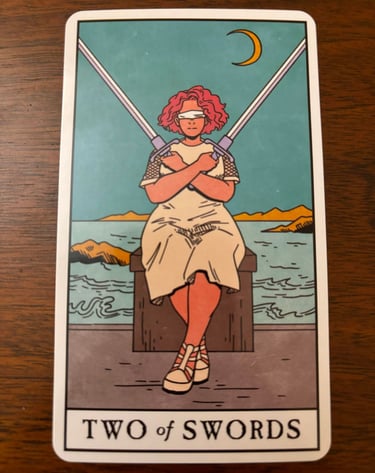 Traditional Imagery: The Two of Swords typically depicts a woman sitting on a bench, blindfolded, with two swords crossed in front of her. Behind her is a body of water with rocks or islands, and the sky is often depicted as calm or moonlit.