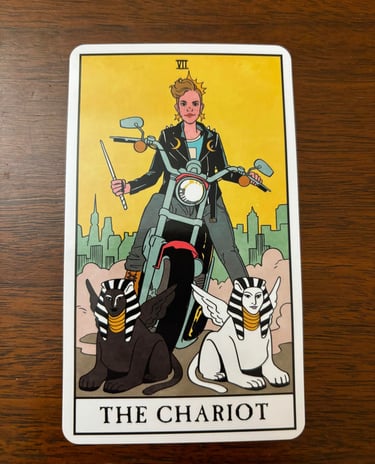 The Chariot is a card of triumph and shows that sheer willpower and determination will lead to victory. It suggests overcoming obstacles through confidence and control. It emphasizes the importance of maintaining control over one's emotions, desires, and direction. The contrasting creatures pulling the chariot symbolize opposing forces that need to be balanced.