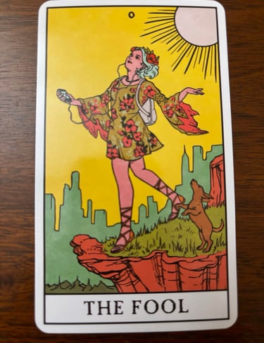 In Tarot, the Fool card is often depicted as a young person, standing at the edge of a cliff with a small bundle slung over their shoulder. They seem carefree and unaware of the potential danger before them. The Fool is numbered as 0 in the Tarot's Major Arcana, signifying new beginnings, innocence, and the start of a journey.
